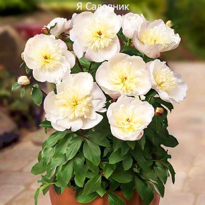 Пион патио Мадрид — это очаровательное многолетнее растение, которое поражает своей красотой и пышным цветением. Куст пиона компактный и плотный, а его стебли прочные и способны выдержать крупные полумахровые цветки молочно-белого цвета с кремовой сердцевиной.